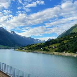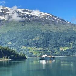 An early start (4.15am) by Chris to watch our journey along Nordfjord from the sea to the end at Olden. It took four hours but the early start was certainly worth it for stunning scenery as the sunLäs mer