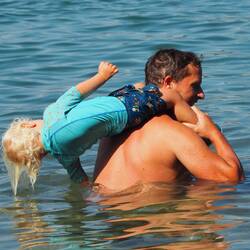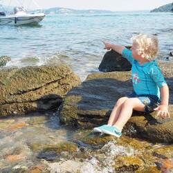 Nous nous posons pour manger sur le port puis sur la plage. Atelier cailloux habituel pour Auguste.