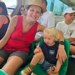 Départ pour sirimone. Nous embarquons les vélos pour éviter la foule et les parkings très cher. Petite partie à vélo avec Auguste en siège bébé. Nous ferons le reste de la presqu'île à piedLeer más