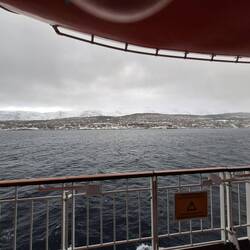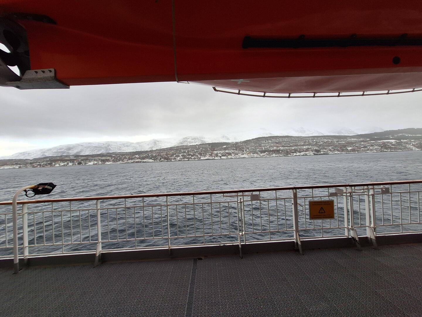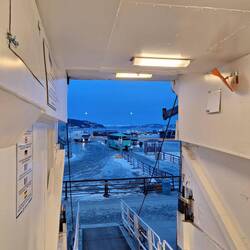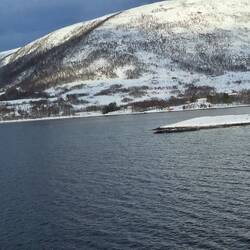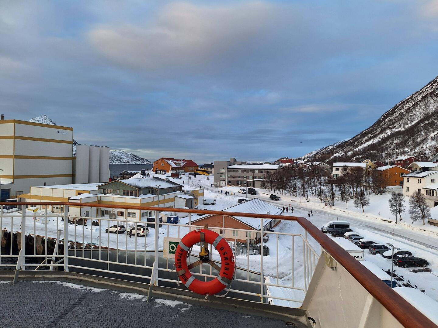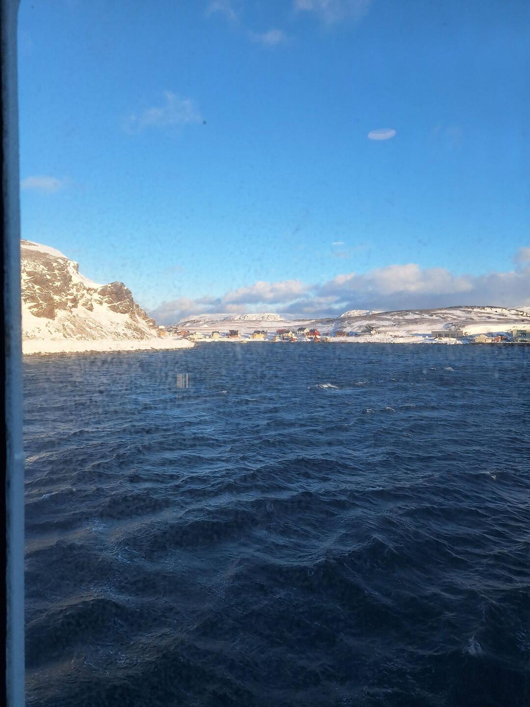 Der Sturm, der uns schon die ganze Nacht begleitet hat, verhindert ein Anlegen im Hafen von Hammerfest. Wir fahren weiter zum nächsten Hafen Ökstfjord.