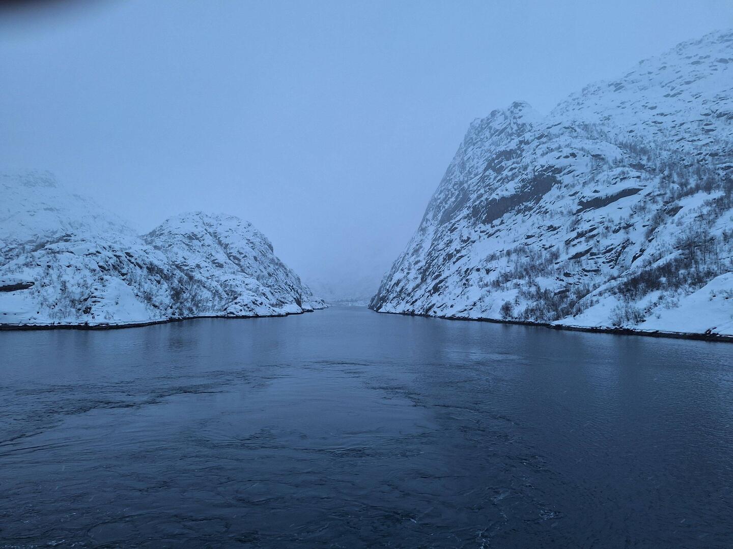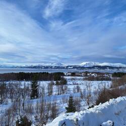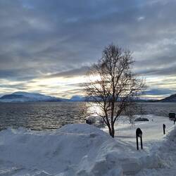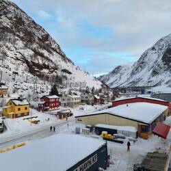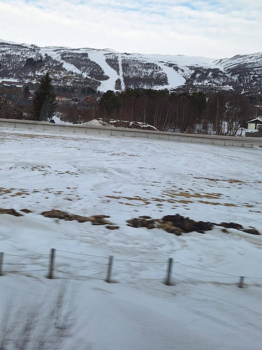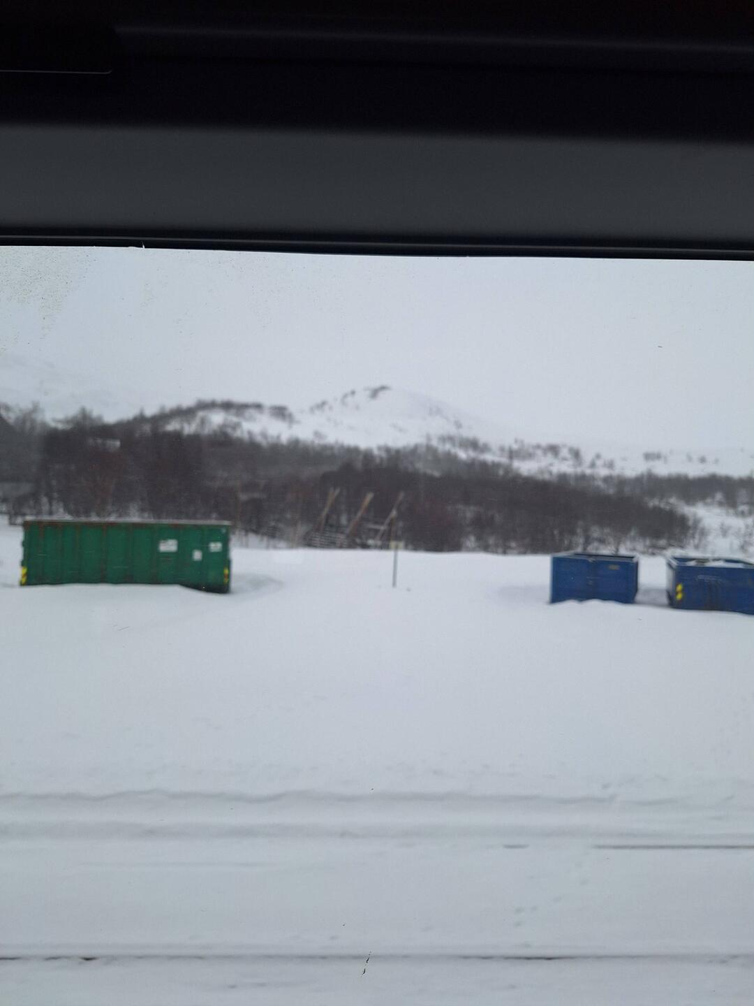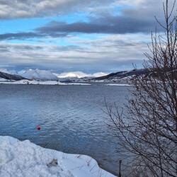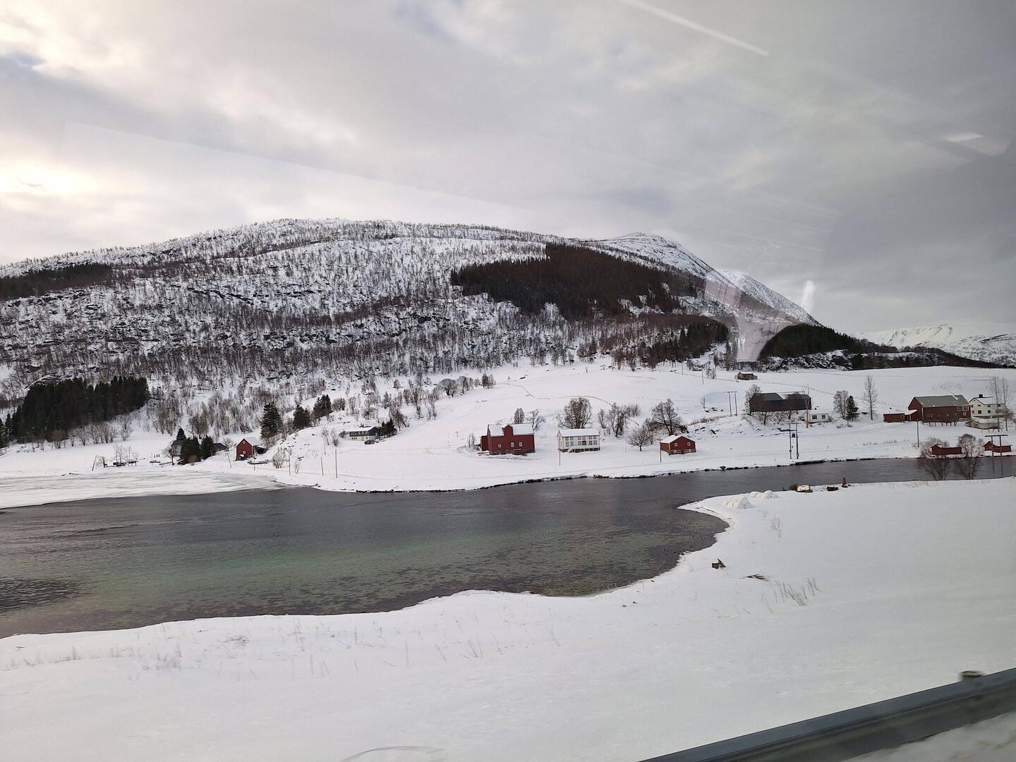 Hier in Brönnöysund ist der Mittelpunkt von Norwegen. Nachdem der Schneesturm, Regen wieder vorbei ist, scheint die Sonne. Aber es ist glatt, also Spikes anziehen.