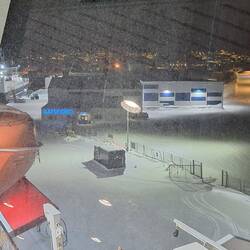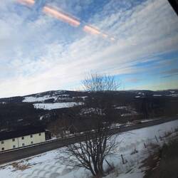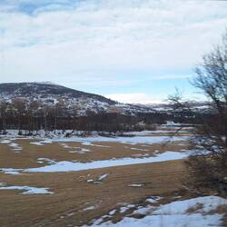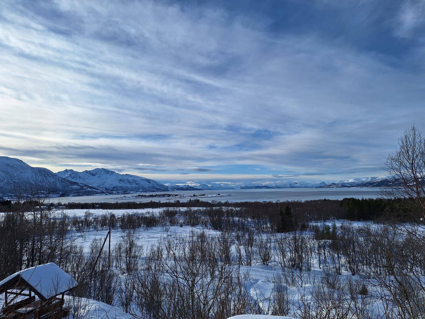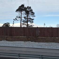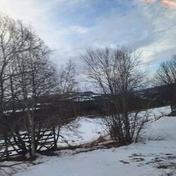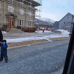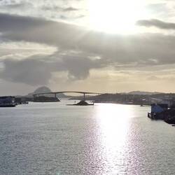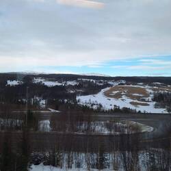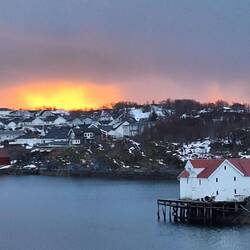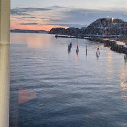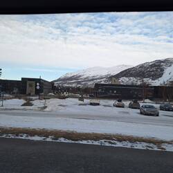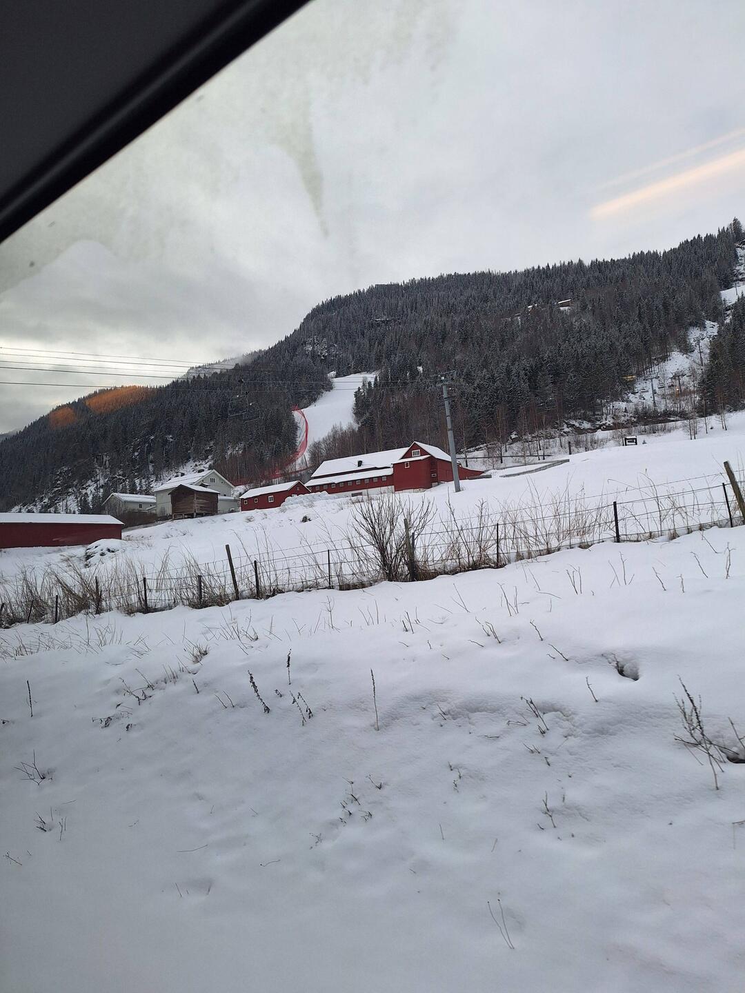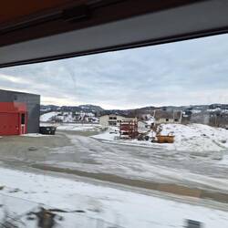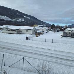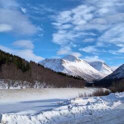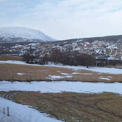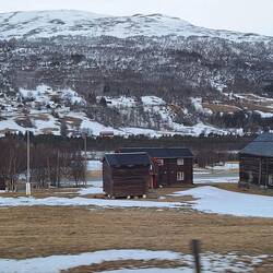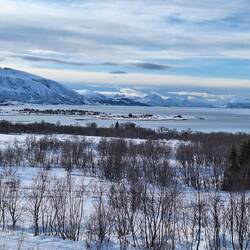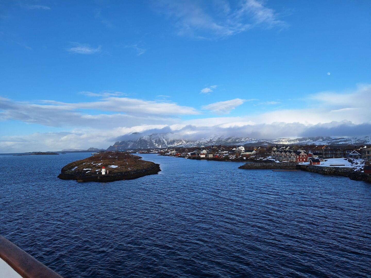 Hier in Brönnöysund ist der Mittelpunkt von Norwegen. Nachdem der Schneesturm, Regen wieder vorbei ist, scheint die Sonne. Aber es ist glatt, also Spikes anziehen.