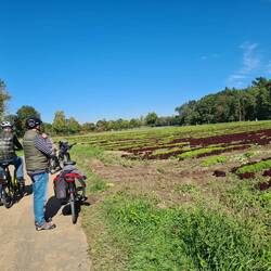 Endlich gibt sich auch die Sonne die Ehre zu erscheinen. Jetzt wird es aber Zeit, zum Stellplatz zurück zu gehen, denn wir haben uns mir Hans und Marion am frühen Nachmittag zu einer Fahrradtour nach Kitzingen verabredet . Und so fahren wir nur wenig später bei strahlendem Sonnenschein entlang des Mains und der Weinberge. Trotz der Sonne ist es ganz schön frisch auf dem Rad. In Kitzingen überqueren wir den Main und fahren auf der anderen Mainseite entlang von Gemüsefeldern zurück. Hier wächst alles, was man für einen leckeren Eintopf braucht: Lauch, Zwiebeln, Blumenkohl, Kohlrabi, Wirsing, Salat und durchgeschossener Spargel (letztere würde ich allerdings nicht in den Eintopf tun;-).