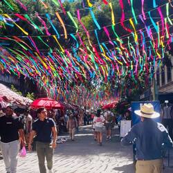 Ganz wie bei uns vor Weihnachten war die ganze Stadt geschmückt. Es gab Skelette, Totenschädel, Bogen aus orangen Blumen und Papierfahnen.
