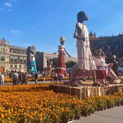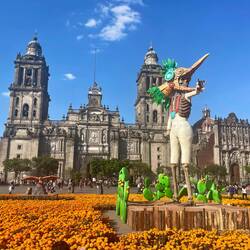 Zusätzlich war in der Stadt überall die Vorbereitung auf Dia de los Muertos zu spüren. Einen Abend spazierten wir mit sicherlich 100.000 anderen eine gesperrte Hauptstraße (sozusagen mexikanische Champs Elysee) entlang und bewunderten beleuchtete Figuren und überhaupt die fröhliche, entspannte Atmosphäre. Auch der zentrale Platz Zocalo war mit vielen vielen Blumen und Statuen geschmückt und abends schauten wir dort einen Film zu Dia de los muertos.