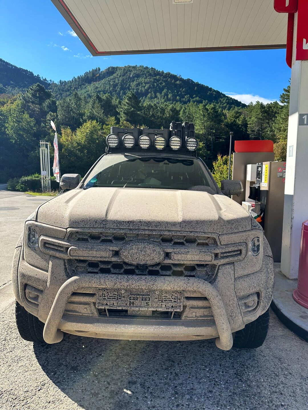 Schön dreckig wie es sich gehört 🤭 und selbst beim Tanken hat man einen wunderschönen Blick auf die Berge.
