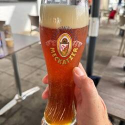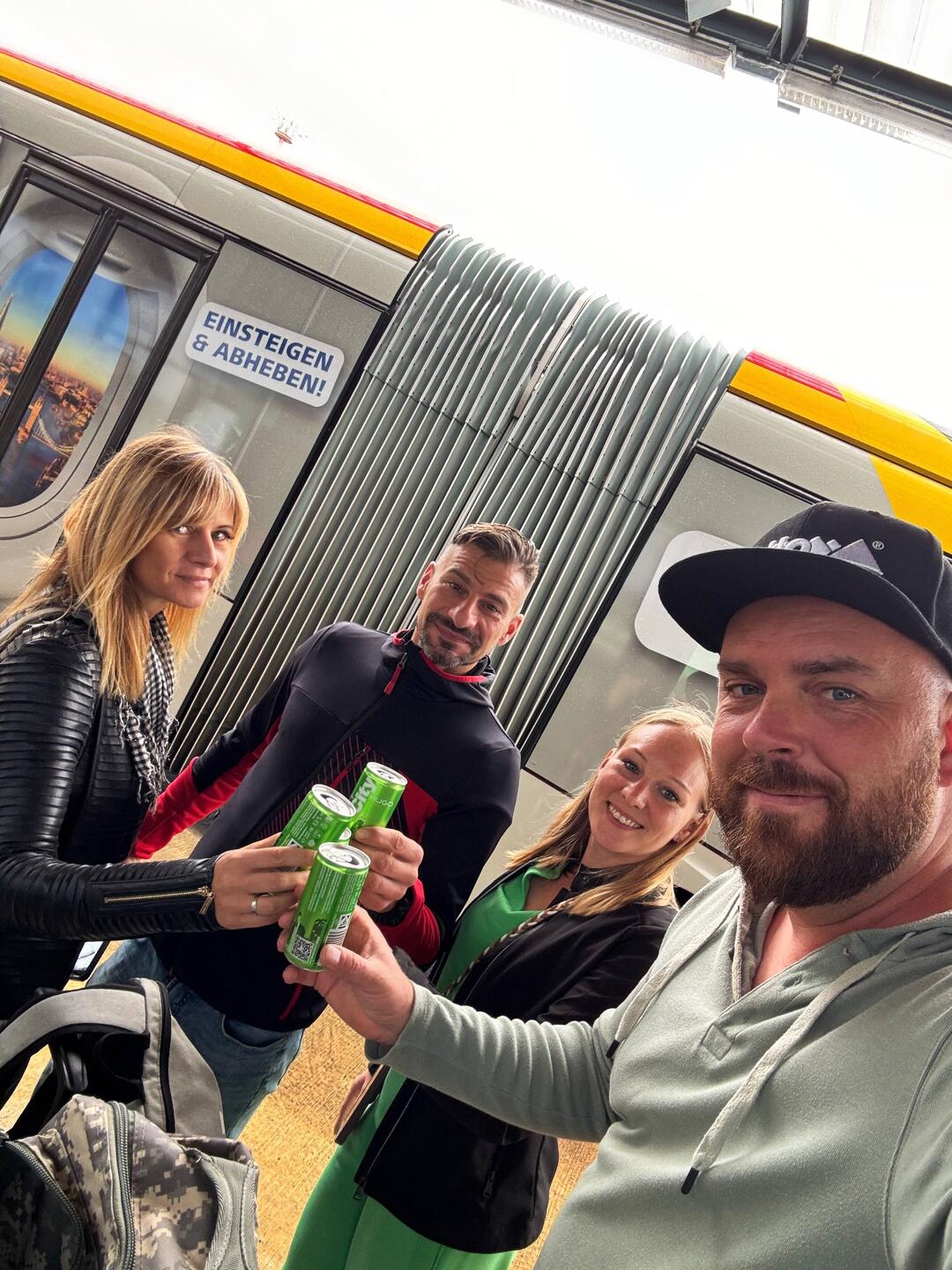 Dieses Jahr haben wir uns um den Sprit gekümmert, da Melli immer den Glücksgriff ins Bleifreie gemacht hat. Und da der Flug Verspätung hat, gibt’s noch a sau guads Meckatzer Weißbier.