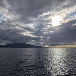 Aangekomen op de pont, en gelukkig met Primatour, want de zee is onwijs wild! Het weer lijkt ineens omgeslagen te zijn, van warm zomerweer naar wind en regenbuien, maar dat mag de pret niet drukken. We zitten tegenover een Frans stel, die bij elke golf een kreetje laat, en dat is wel vermakelijk.