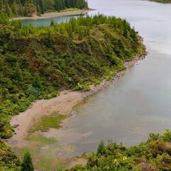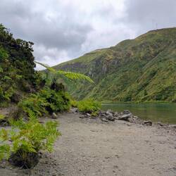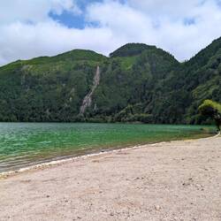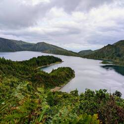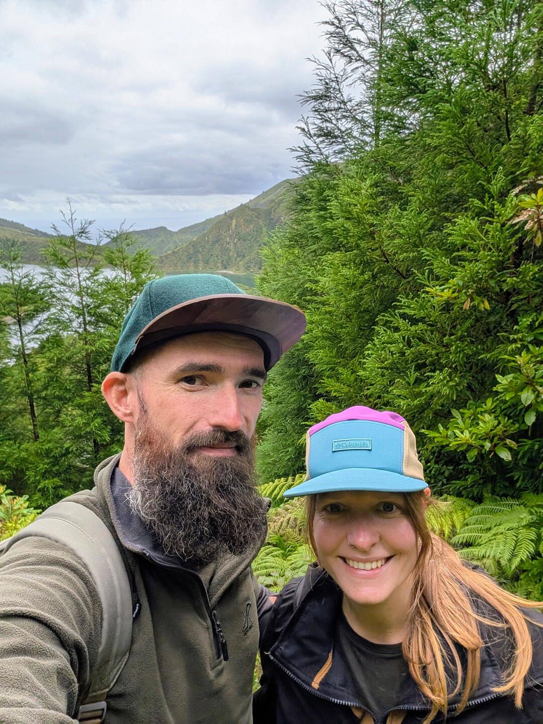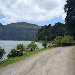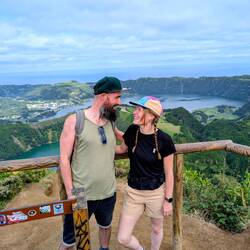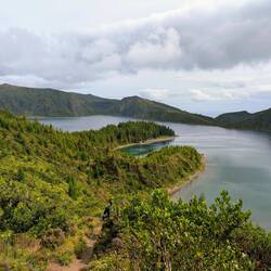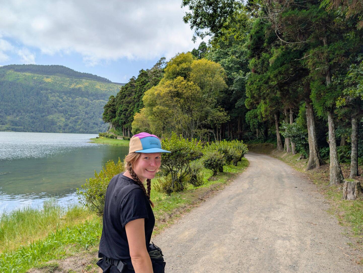 Totaal onvoorbereid en zonder precies plan gingen we eerst maar op zoek naar lunch, en vonden buiten de stad een leuke foodtruck met ook vegaburgers en we hadden wel zin in een ritje met de huurauto. Verder op die weg zagen we nog wat gave plekken dus we vertrokken in die richting. Precies bij de foodtruck was de weg afgezet, dus we parkeerden de auto en gingen eerst lekker eten. Er kwam een bus aan die wel door de wegafsluiting mocht, en we stapten maar in! We reden door smalle kronkelende weggetjes door naar een van de mooiste plekjes die wij ooit hadden gezien, een kratermeer met de naam Lagoa do Fogo (Meer van Vuur) helemaal Jurassic Park vibes! Wat een pareltje! Bovenaan het viewpoint bleven een aantal mensen staan, maar druk was het er zeker niet. We zagen een pad naar beneden en besloten dat we wel zin hadden in een wandeling. Stijl naar beneden door jungle achtige paden en trappetjes kwamen we bij een oase van rust aan! Max 10 mensen hadden deze wandeling ook aangedurfd, maar het was zo groot dat we er praktisch alleen waren. Wat een geweldige plek!!
