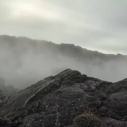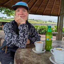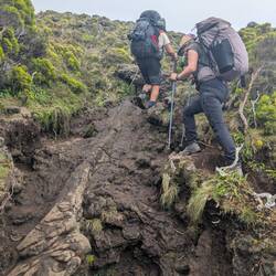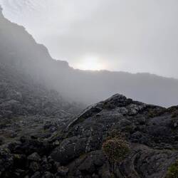 Tijd om de afdaling in te zetten. Ehh, hoe?? Nou, zoals een spinnetje, handen en voeten, en soms op je billen! Wel even spannende momentjes, maar zonder kleerscheuren zijn we beneden. Beeldmateriaal hebben we niet, we waren bezig met overleven maar geloof ons, dat was spannend. We gaan nog even lekker zitten op de rand van de krater voor een ontbijtje met de dezelfde inhoud als gisteravond, geen culinaire hoogtepunt maar wel voedzaam. We zetten de afdaling in, en zijn al gewaarschuwd dat het pittiger is dan de weg naar boven. Nou, dát hebben we geweten pff! Wij niet bepaald berggeitjes uit ons platte Nederland, en ook zijn de paden veel modderiger dan gisteren door de mist en regen uit de lage wolken, hier en daar ligt er zelfs een beetje ijs op het pad! We glibberen naar beneden, en gelukkig krijgen we steeds meer vertrouwen in onze grip en onze walking sticks. Het is een stuk warmer dan gisteren en we pellen langzaam onze laagjes af, als een 'hot onion', waar we verschrikkelijk om lachen met zijn 3en. We halen af en toe grote groepen in, maar worden ook regelmatig ingehaald. We nemen weinig ruststopjes om de vaart er een beetje in te houden. Ook zien we af en toe groepjes omhoog klimmen, en het is een leuk spelletje om te raden of ze het gaan halen of niet met onze gids. We zien de parkeerplaats steeds dichterbij komen, en nemen 1 uitgebreidere stop bij de 'shelter cave' waar vroeger werd geslapen voordat er een mountain house en de weg tot 1200m was, dit was destijds het halfweg punt van de reis. Een half uur later arriveren we weer bij de mountain house, we hebben het gehaald! Kapot, zere knieën, voeten, tenen, benen, rug, alles! Maar ook heel blij en wat was dit een hoogtepunt!