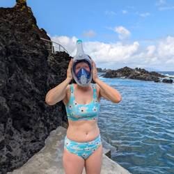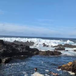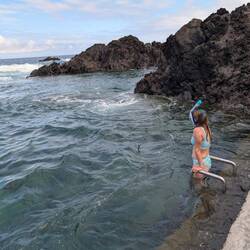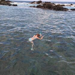 Ons appartement is nog niet klaar (later weten we waarom!) en dus nemen we een lekkere duik in de oceaan. Er zijn wat inhammen met een trappetje, de natuurlijke zwembaden hoe ze hier aangemerkt zijn. Súpermooie kliffen en het doet ons een beetje aan de kust van IJsland denken. Beetje spannend voor Nien, hoge golven en nergens om te staan als je eventjes paniek hebt, maar met de zwemlessen van Hans in het achterhoofd toch erin. Enorm veel vissen te zien, mega leuk!! Jammer dat je daar niet makkelijk een filmpje van kan maken maar geloof ons, echt veel vissen! Zijn allemaal lief, en er is 1 soort kwal, de Portuguese man o' war, waar je voor moet oppassen en natuurlijk in de volle open oceaan zwemt er wel vanalles, maar de golven zijn daar ook mega hoog dus lijkt ons sowieso onverstandig. Snorkelen gaan aan we vaker doen deze vakantie!