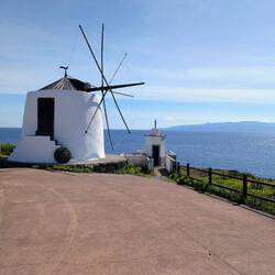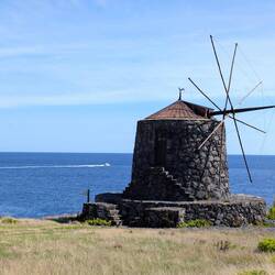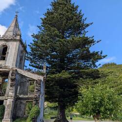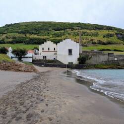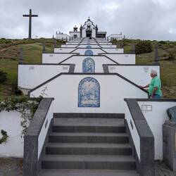 Op naar de oostkant dus, naar een vervallen kerk. Hij is tot 2 keer toe hersteld, maar door aardbevingen telkens ingestort en nu hebben ze maar een klein exemplaar ernaast gebouwd. Het oude pand is in verval geraakt en nu een prachtig fotopunt, al zijn wij de enige hier. Prima! We rijden 5 min verder naar de kust, en kijken uit op Pico, het eiland en de gelijknamige vulkaan waar we morgen heen gaan, en met een beetje geluk zaterdag op zondag slapen!
