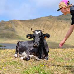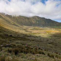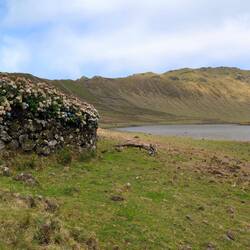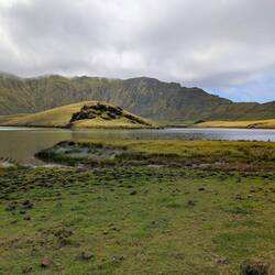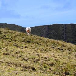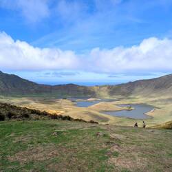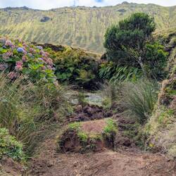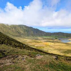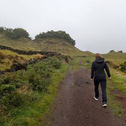 Corvo is eigenlijk 1 vulkaan, met een hele grote caldera/krater in het midden. Eenmaal op land konden we met de taxi mee naar de rand van de krater, en een 5k hike maken door de caldera. Dat hoef je geen 2 keer te zeggen! In onze taxi zaten 2 andere Nederlandse, een moeder met dochter, en de dochter werkte voor Riksja, de reisorganisatie waarmee wij hebben geboekt! Wat een toeval! We 'adopteerden' deze moeder en dochter en gezellig kletsend liepen wij onze wandeling, wat voor hun een erg avontuurlijk was we hielpen ze hier en daar met een handje over de hobelige en modderige stukken.
