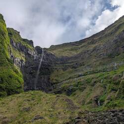 Eerst was Poço da Ribeira do Ferreiro aan de beurt. Dit is hét plaatje van Flores, en het was zoo prachtig hier. De hike er naartoe was niet te moeilijk maar wel stijl omhoog, 1,5 km over een sprookjesachtig stenen pad, met hier en daar al kleine watervalletjes! Eenmaal bij de echte watervallen aangekomen genoten we van het uitzicht! Op een bankje gemaakt van een boomstam eten we nog wat snacks om de energie weer aan te vullen voor de volgende hike.