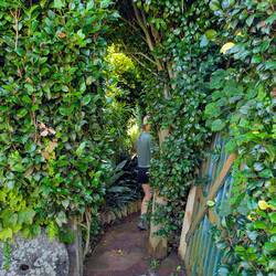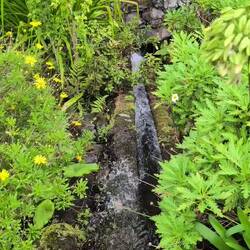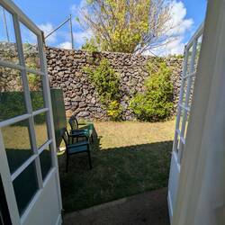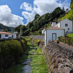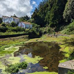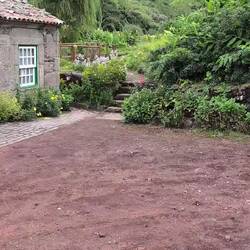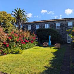 Een enorme moestuin, een groot stuk weiland met 3 koeien, een doolhof van hagen met daarin een kippenren met de blijste kippetjes ooit, een kas met nog meer verse groente en fruit en bananenbomen, sinaasappelbomen, mango bomen, van alles! Geweldig om rond te dwalen. Overal schieten de hagedissen weg tussen de warme stenen. Een waterval hoort ook bij de tuin, al staat die op moment droog. Sowieso is het vrij droog en zonnig voor de tijd van het jaar hier in de Azoren!