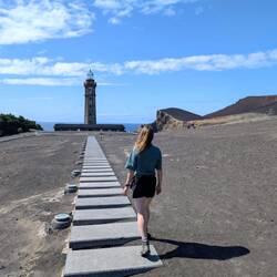 Het uitzicht op deze kale stukken land was prachtig, en ondergronds is er een museum gebouwd over vulkanen en vooral deze vulkaan. Leuk en informatief! Het museum eindigt bij de oude vuurtoren, die toen het puntje was van dit eiland, moet je nagaan hoeveel grond er is bijgekomen. We klimmen helemaal naar boven en hebben een geweldig uitzicht.