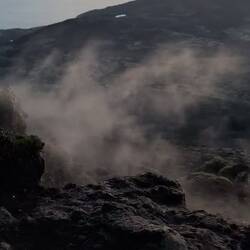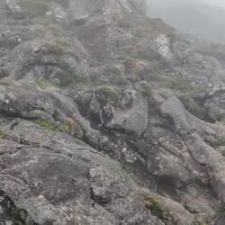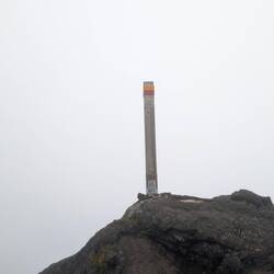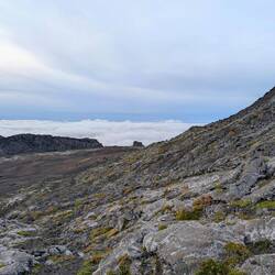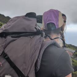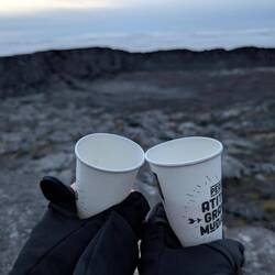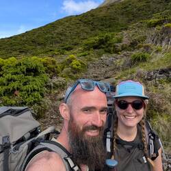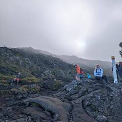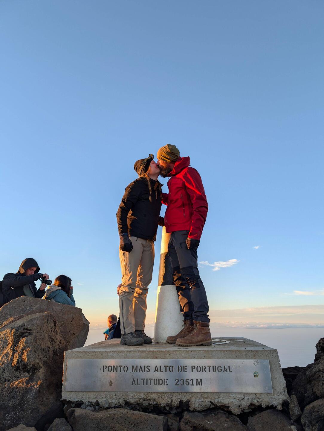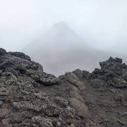 Het eerste uurtje ging eigenlijk best makkelijk, en onderweg hadden we prachtige uitzichten op Faial en Madelena, de 'hoofdstad' van Pico en waar ons hotel zich ook bevindt. Het terrein verandere langzaam, de bomen werden bosjes en er kwam een mist om ons heen, we zijn in de wolken! Onze eerste langere rustpauze kwam eraan en we genieten van wat welverdiende snacks. Na een minuut of 5 gaan de zware backpacks weer om en lopen we verder. Het volgende uur werd het terrein stijler, de omgeving stiller en voor we het wisten waren we bij de 'false peak', ofwel paaltje 33 van de 47. Deze valse top lijkt een top te zijn maar is het niet, goed voor de motivatie dus haha. We voelen ons eigenlijk hartstikke fit, en skippen een lange pauze voor een korte drink en plaspauze. Op naar de krater! We lopen nog 1,5 uur door, en ook dat gaat redelijk, al zijn we het klimmen wel inmiddels een beetje zat. De verhalen van onze gids over Pico, zijn leven en vanalles en nog wat houd ons op de been en lekker afgeleid van onze pijntjes haha. Het is inmiddels ook best fris, en we krijgen het koud! Maar gelukkig is daar de rand van de krater! De hele krater staat nog in de hoge wolken en mist, hopen dat het wegtrekt. Onze gids geeft dat niet veel kans, er zijn veel hoge wolken en mist voorspeld en dat wisten we eigenlijk ook al. We zetten onze tentjes op en gaan lekker zitten op een stuk lavasteen. We hebben omdat het onze huwelijksreis is en omdat het kan een fles champagne meegenomen, maar onze gids drinkt niet, dus wij hebben het lekker warm vanavond haha! Proost! De mist trekt ineens weg, maar veel zien we niet van de zonsondergang.
