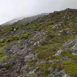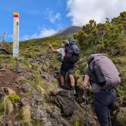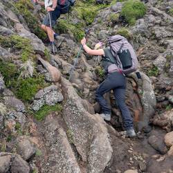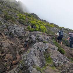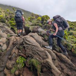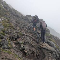 Er zijn veel hogere bergen te vinden, maar deze beklimming staat als erg zwaar aangegeven door het ruige terrein en door het bizarre gemiddelde stijgingspercentage van 30%! Het wordt wel omschreven als "3.5 uur trap oplopen, en dan 4 uur trap aflopen". Er zijn stukken waar je op handen en voeten moet, en er zijn ook hele stukken zonder duidelijk pad dwars over de vulkanische stenen. Het kán zonder gids, maar verstandig als wij toch zijn hebben wij een gids geboekt, zeker omdat wij ook willen overnachten in de krater.