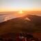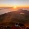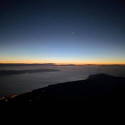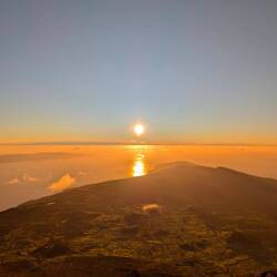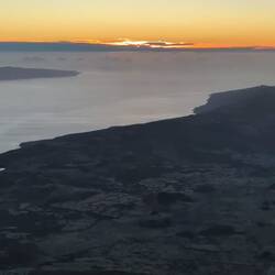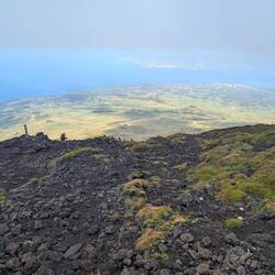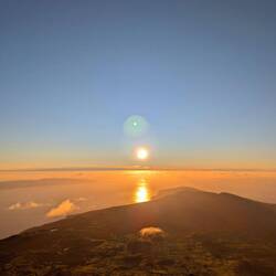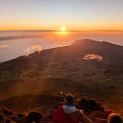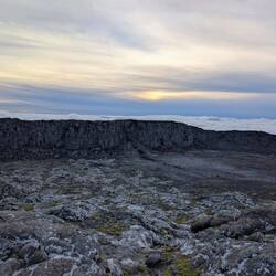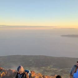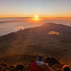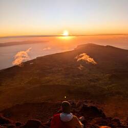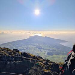 Bovenop de top is het nog rustig en we zoeken een lekker plekje uit, er is een stukje vlak om op te zitten. Er arriveren steeds meer mensen maar echt heel druk wordt het niet, wel luid, want een groep Portugezen en een groep Duitsers zijn wat aanwezig. Achja, we hebben wel het mooiste plekje. De zon komt langzaam op, en we zien steeds meer eilanden in de oceaan. Faial natuurlijk, Sao Jorge, Graciosa, Pico zelf en ook Terceira is zelfs zichtbaar, zo helder is het het hele seizoen nog niet geweest! We zien een geweldige zonsopkomst en ook de gidsen die dit wekelijks zien zijn zichtbaar onder de indruk, zo helder en dat nog wel met zo'n slechte voorspelling!