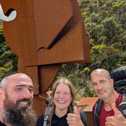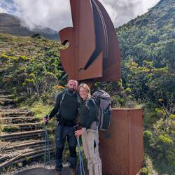 We ontvangen nog een certificaat bij inleveren van onze SOS knop en nemen een foto bij het standbeeld van de beschermengel van de klimmers van de berg met onze gids, wat een lieve en leuke man. Hij vertelt ons dat dit een van zijn favoriete klims dit seizoen was en bedankt ons voor de gezelligheid, en na het ompakken van de geleende spullen nemen we afscheid.