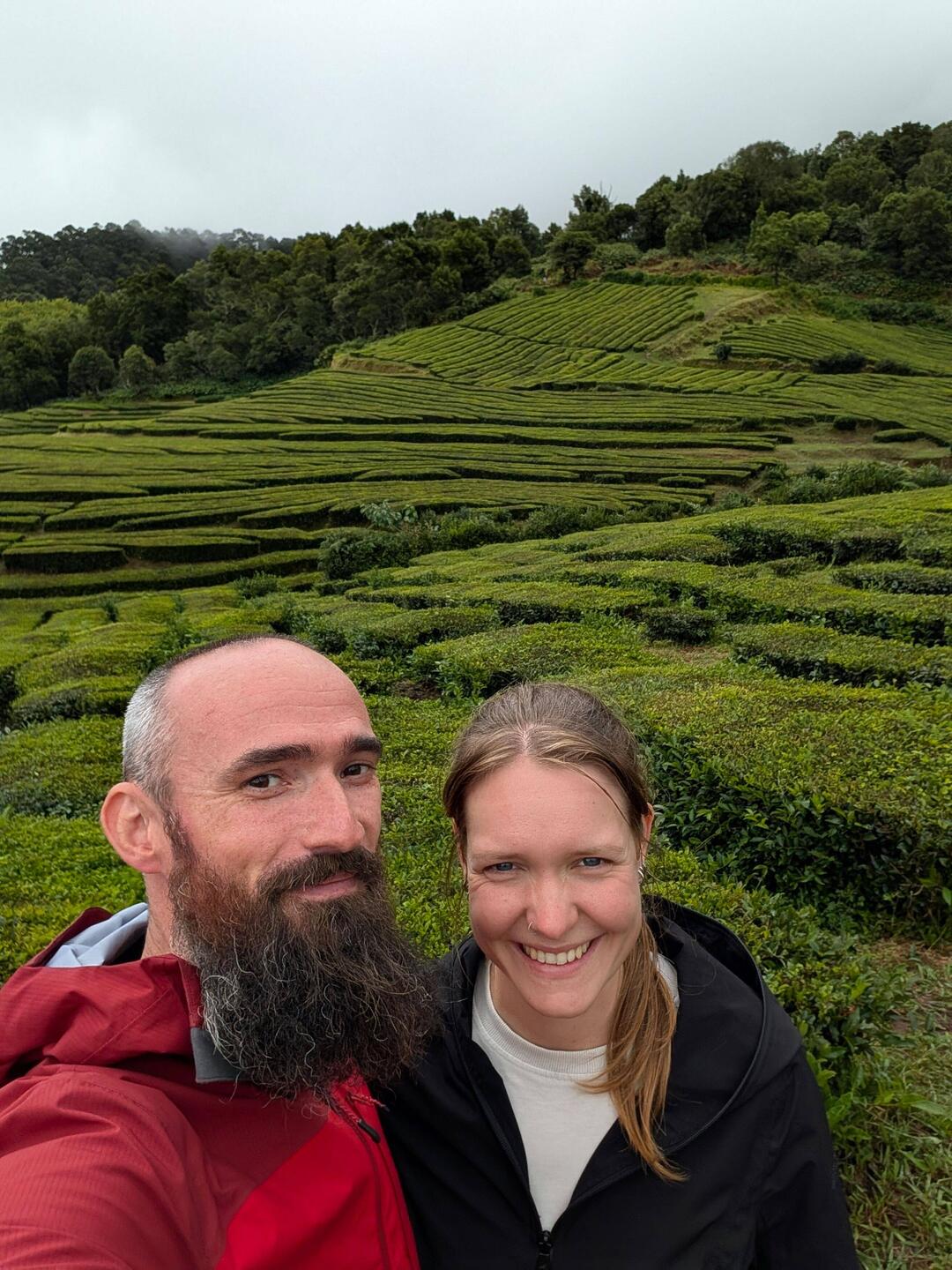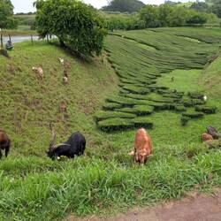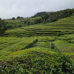 Dan maar naar de theeplantage! Een van de weinige Europese theeplantages is hier, vanwege het vochtige en relatief warme klimaat groeit thee hier goed. Er was een museumpje dat matig interessant was, maar de theeplantages waren prachtig en wat hebben we gelachen om de eigenwijze geitjes, die eigenlijk het gras en het onkruid moesten opeten, maar die we regelmatig zagen met hele takken thee in hun bekketjes, en de Boer die ze terug probeerde te fluiten.