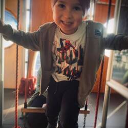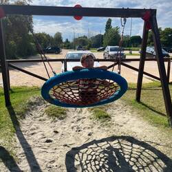 Nach dem Frühstück probieren wir den Spielplatz aus, den Pepe und Marco am Vorabend entdeckt haben. Pepe klettert und rutscht, und auch Merle kommt nicht zu kurz – sie erkundet neugierig ihre neue Umgebung.