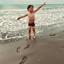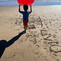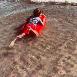 Zum Abschluss zieht es uns noch einmal ans Meer. Kaum angekommen, grinst uns Merle direkt an. Sie freut sich riesig, am Strand zu robben und zu turnen, während Pepe und Marco mit dem Piratenschiff durch die Wellen segeln.