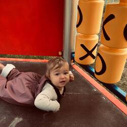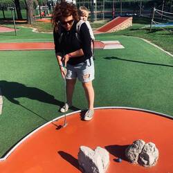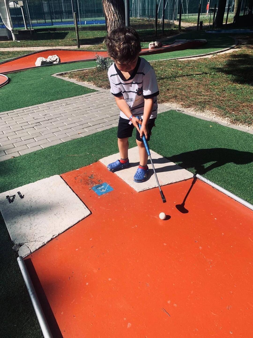 Pepe hat sich für den letzten Urlaubstag gewünscht, noch einmal alle zusammen Minigolf zu spielen. Damit wir alles, was er sich vorgenommen hat, auch schaffen, kommt Merle in die Trage und wir laufen direkt nach dem Frühstück los. Der Plan geht auf: Während wir alle Bahnen spielen, schläft Merle ihren zweistündigen Mittagsschlaf gemütlich bei Judith auf dem Rücken 😮💨 – Minigolf, Mittagessen und Badesachen packen quasi „im Stehen“ 😅.
