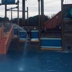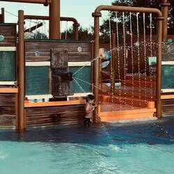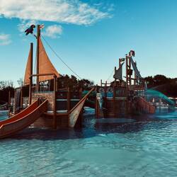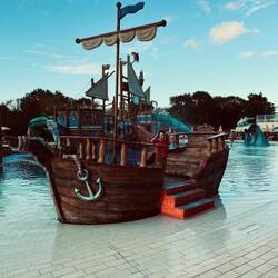 Und wir werden nicht enttäuscht – der Himmel klart tatsächlich auf. Also schnell Badesachen packen und ab zum Pool! Dort erwartet uns eine riesige Piraten-Playhouse-Landschaft. Pepe kommt aus dem Rutschen und Erkunden des Piratenschiffs gar nicht mehr heraus, während Merle und Judith das Ganze lieber aus der Ferne beobachten 😅. Für Merle reicht die Wassertemperatur nur für ein kurzes Fußbad – immerhin!