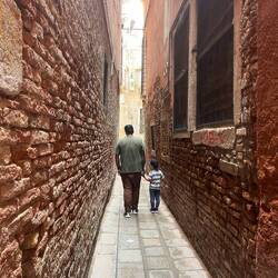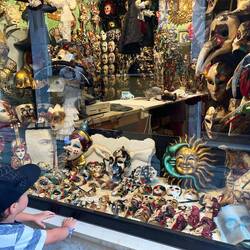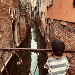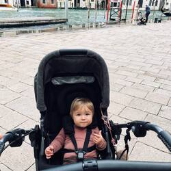 Wir kommen aus dem Staunen nicht mehr raus: Die vielen Brücken, verwinkelten Gassen, Kanäle, Gondeln und kleine Läden sind einfach toll. Besonders beeindruckend: ein Krankenwagenschiff, das mit Blaulicht über den Kanal düst. Die Masken unterwegs zu zählen haben wir schnell aufgegeben – vielleicht auch eine etwas unkluge Aufgabe, weil Pepe bei jedem Souvenirladen stehen bleiben möchte 😅. Laut Internet gibt es in Venedig 400 Brücken – wir haben offensichtlich nicht darüber nachgedacht und müssen über gefühlt 200 davon den Kinderwagen tragen 🙈.