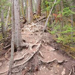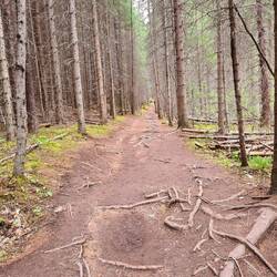 auf dem rückweg nach golden gabs einen halt beim wapta fall, der wieder mit einem abenteuerlichen spaziergang durch den wald verbunden war. neben dem weg waren die auswirkungen früherer stürme noch deutlich sichtbar. überall hatte es umgestürzte bäume.