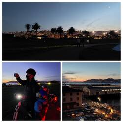 Wir kommen beim Fishermen's Wharf an, alles ist beleuchtet und bietet den wenigen Touristen dort gute Unterhaltung mit Musik und Showeinlagen. Damals haben wir hier Krabbenbrötchen gegessen. Heute hingegen meiden wir natürlich die Menge, fahren an der Küste entlang und überlegen, wie die Sterne heißen, die schon zu sehen sind (100 Punkte für mich: die Venus! Die Chancen standen gut, da sie auch der Abendstern genannt wird ;-). Wir fahren durch Marihuanaschwaden (legal hier!), aber sonst ist wenig los. Die Kids beginnen ein wenig zu frieren – es ist wirklich Zeit zurückzufahren, aber Thomas und ich würden am liebsten noch weiter, die Atmosphäre ist gigantisch, ich sauge jeden Augenblick auf.