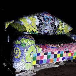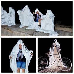 Als Jen und ich noch auf dem Weg sind, geht die Sonne bereits unter, zu lange stand sie im Stau, und wir erreichen die Geisterstadt im Dunkeln: „Wie Sie sehen, sehen Sie nichts!“, würde ich mal sagen. Aber Jen wäre nicht Jen, hätte sie nicht die passende Ausrüstung für dieses Unterfangen in ihrem Auto, derzeit ihrem eigentlichen „Heim“, nachdem sie für dieses Jahr ihre Wohnung gekündigt und ihren restlichen Besitz eingelagert hat. Sie holt zwei riesige Scheinwerfer hervor, hell genug, um damit nachts am Bau zu arbeiten, und wir machen uns mit ihnen zu einer Tour durch die Geisterstadt auf, in der tatsächlich Geister auf uns warten sollen. Wir passieren zunächst einige Gebäude, sehen eingefallene Hütten und einen verrosteten Truck mit Banksy-Motiv im letzten Licht der Sonne, dann das Bahnhofsgebäude. Es ist schon ein wenig unheimlich hier, nachts, so ganz alleine. Dann stoßen wir auf das Museum und dessen Gespenster, die der Künstler Albert Szukalski in den 80er Jahren aus Acryl angefertigt hat und die heute allein diese Stadt bewohnen. Wir mischen uns unter sein „Letztes Abendmahl“ und versuchen das Fahrrad des einsamen Geistes zu entwenden... Auch die Pink Lady und die Mosaikcoutch finden wir im Dunkeln. Für das Bottle House werden wir aber wohl bei Tag noch einmal wiederkommen müssen, so finster wie es ist, und treten den Rückweg an.