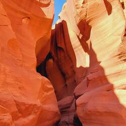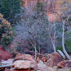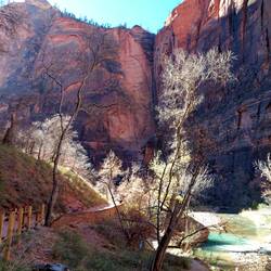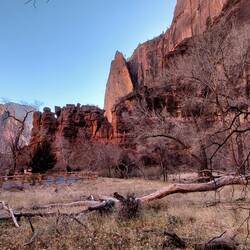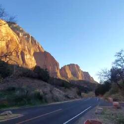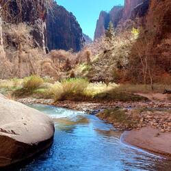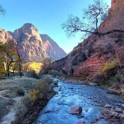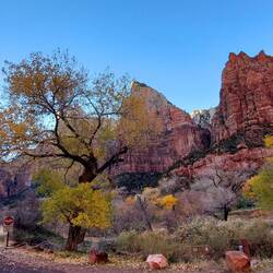 Diesmal kann ich nun auch den Zion Canyon Drive bis zum Ende durchfahren – am Vortag war der Zugang wegen zu vieler Besucher bereits gesperrt - „früh“ zu kommen lohnt sich also. Leider gibt es kaum Haltemöglichkeiten am Wegesrand, zu schön sind die rötlich-orangenen Felswände, die sich rechts und links von mir in den Himmel erheben, sodass ich gerne öfter halten würde. Überall säumen stattliche Bäume, deren Blätter sich bereits gelb verfärbt haben, den Wegesrand. „Ja“, stelle ich fest, „Zion erscheint mir ein recht passender Name für diese Idylle“ – auch die Bezeichnung des Tempels von Sinawava, den ich ansteuere. Denn der Ort ist umhüllt von diesen wunderbaren und extrem hohen Bergen, so geschützt und dennoch exponiert in der Landschaft, die mehrgliedrigen Felstürme ragen wie Säulen empor.