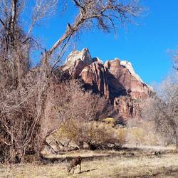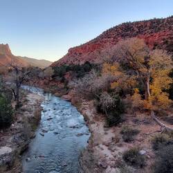 Diesmal schaffe ich es auch zum Sonnenuntergang, der besonders schön von der Brücke bei der Abzweigung zum Scenic Drive und vom Pa'rus Trail aus zu sehen ist, und die Landschaft in ein goldenes Licht taucht. Als noch ein paar Rehe über die Straße huschen, kommt mir der Tag dann doch wirklich gelungen vor. Ich treffe noch meinen Bruder und seine Frau in Washington/Utah zum Essen bei Taco-Bell (love it!), nachdem sie sich nach einer Thanksgiving-Einladung auf dem Rückweg nach Vegas befinden. (Übrigens: keine Mundschutz-Pflicht in Utah!) So klein kann die Welt um den Zufluchtsort Zion dann doch sein!