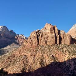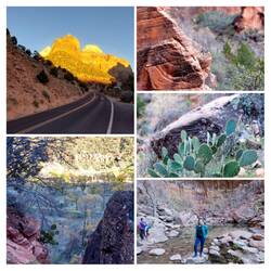 Das Wetter ist fantastisch: blauer Himmel, Sonne, 20 Grad. Innerhalb dieses Naturschutzgebiets befindet sich eine Landschaft voller Schluchten, von denen der Zion und der Kolob Canyon die bekanntesten sind. Beide sind aus altem orangerotem bis braunen Sandstein der Navajo-Formation entstanden und rund 170 Millionen Jahre alt. Die bekanntesten und nahezu legendären Touren – the „Narrows“ (Flusswanderung) und „Angels Landing“ (bereits 10 Todesopfer durch Absturz) fallen in meinem Zustand ohnehin flach, Frieren und Schindel in extremen Höhen sind heute nichts für mich. So schaffe ich es zumindest an einigen Fotospots zu halten, die Patriarchen zu bewundern und alle Emerald Pools zu bewandern (Lower, Middle, Upper Emerald Pool). Die ca. zweistündige Tour fordert mich dennoch heraus, obwohl sie recht einfach zu begehen ist und normalerweise ein Kinderspiel für mich wäre: Schweißausbrüche, Abgeschlagenheit, leichte Übelkeit... Irgendwie bin ich einfach nicht fit! Dennoch sind die Bergmassive, die sich um mich herum türmen, imposant und es eröffnen sich so viele schöne Ansichten der Landschaft, dass ich dennoch beginne, den Tag zu genießen. Auch treffe ich eine Mutter mit ihrer Tochter, die doch tatsächlich in Hilo /Hawaii Big Island studiert hat, und mir einige Anekdoten vom Leben dort erzählt: falscher Raketenalarm, Vulkanusbruch, lieferengpässe, etc. Wie einfach doch mein Studium verlaufen ist, denke ich– jedoch auch ohne den schönen Carlsmith Beach, über den wir beide ins Schwärmen kommen.