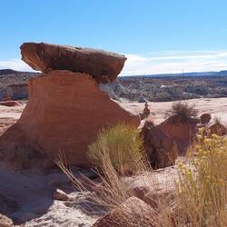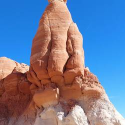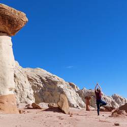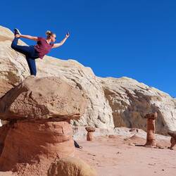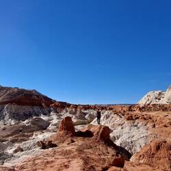 Madeleine, meine Nichte, und Sean nehmen mich auf einen Ausflug dorthin mit – auch mit von der Partie sind Fipsie und Furn, die beiden Hunde der beiden. Eintritt: 10 USD. Wir durchqueren zunächst den Park und arbeiten und von hinten nach vorne durch. Beginnend beim White Domes Loop geht es zu unserer ersten Tour. Sean und ich begehen den Weg teilweise kletternd, während Madi lieber spaziert – die Hunde flitzen zwischen uns immer hin und her. Seans vermeidliche Abkürzungen fordern sowohl Furn als auch mich – leicht nervös steigen wir nicht ganz ideale Felsformationen mit Hund hinunter. Aber alles geht gut, auch wenn ich den Eindruck habe, dass sich Seans Schuhe demnächst auflösen werden. Drüber hinaus diente dieser Ort wohl einer Folge Star Trek (Treffen der Generationen) als Kulisse; wir passieren die Überreste des ehemaligen Sets, eine simple Ziegelmauer. Der Weg eröffnet uns wunderschöne Ansichten auf die rötlich-weiß-gelben Gesteinsformationen, die in Canyons, Stelen und verschiedenen Aushöhlungen ihre aktuelle Form gefunden haben. Auch durchqueren wir die „white domes“ - eine enge Passage, in der die Feldwände so dicht stehen, dass man an einigen Stellen an ihnen beiden hocklettern kann. Ich liebe es!