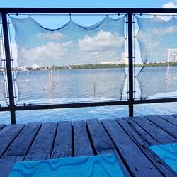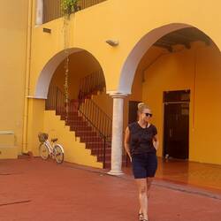 Das Mayan Monkey Hostel in Cancun bietet einen guten Ausgangspunkt für meine Reise: Lagunenblick, Pool, Bar, Billiardtisch, Rutsche in die Lagune (leider gesperrt), Coworkingspace, Sofalandschaft, Yoga am Pier draußen und andere Aktivitäten werden geboten, alles ist offen und openair gestaltet und ich finde immer ein ruhiges oder belebtes Plätzchen für mich. Mir wird gleich der „Surfing Burrito“ empfohlen, wo ich mit allem versorgt werde, sodass ich mich nach zwei Stunden erst einmal ausruhen muss. Den DJ am ersten Abend verpasse ich fast... Ich schaffe es dennoch nach draußen auf das Dock und lasse den Abend gemütlich ausklingen – nicht ohne mich mit Steven, einem Californier, am nächsten Tag zum Yoga zu verabreden. 11 Uhr Yoga im Freien für die nächsten zwei Tage - Blick in die Lagune, umweht von einer sanften Brise. Alma, unsere Trainerin, bringt uns ganz schön ins Schwitzen, aber es tut unheimlich gut. Mein Training der letzten Wochen hat sich ausgezahlt, ich kann es regelrecht genießen! Am Ende der Stunde – während der Entspannungs- und Meditationszeit geht sie herum und massiert Öle in unseren Nacken, auf die Schultern, die Stirn, am Ende in die Handfläche – ein so wohltuendes Gefühl, die Haut kribbelt, es duftet nach Pfefferminz und anderen ästherischen Ölen. Wow! Das war eine der wohltuendsten Trainingsstunden, die ich je hatte!