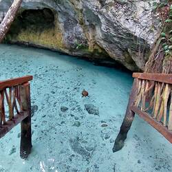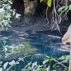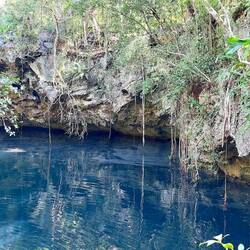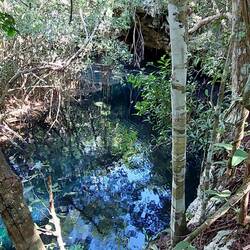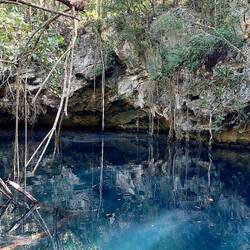 Unsere Tour führt uns gleichermaßen etwa eine halbe Stunde durch den Dschungel, den wir schwitzend passieren, bis wir dann unser Ziel erreichen - eine Cenote, also ein tiefes höhlenartiges Süßwasserloch. Das Wasser ist so klar, dass man auf den Grund schauen könnte, wenn es hier nicht so tief hinabginge. Die Cenoten sind in der Region Yucatan häufig zu finden, es gibt wohl beinahe 8000, die früher als Süßwasserquellen verwendet wurden. Sie werden von Regenwasser gespeist und sind alle unterirdisch durch ein gigantisches Höhlensystem miteinander verbunden. Immer wenn die Erosion so weit fortgeschritten ist, dass Teile des Gesteins einstürzen, bildet sich eine solche Cenote.