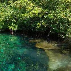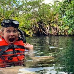 Bald geht es schon weiter (Ich muss wiederkommen, entscheide ich!) – wir gehen Schnorcheln zur Cenote Manati – einer wunderschön gelegenen Cenote, umgeben von Mangroven. Uriel informiert uns über die zwei Bewohner der Cenote, je 2-2,50m groß, zwei Krokodile, denen er humorvoll einen Namen gibt. Er erklärt, wir sollen urinieren im Wasser unterlassen, da dies die Tiere anlocke, auch sollten wir sie nicht streicheln. (Wer würde schon ein Krokodil streicheln?!) Das alles war so voller Humor gespickt, dass ich die ganze Geschichte schlichtweg für einen großen Scherz gehalten habe... - Weeeeeeit gefehlt. An Ende dieses Tages sollte ich tatsächlich mit Krokodilen geschnorchelt sein. Ich ahne nichts Böses und genieße jede Sekunde in diesem unfassbar klaren und herrlich erfrischendem Wasser. Mangroven von unten! Als ich Mo in die Seite kneife, fährt er erschrocken herum – er hat die Krokodilgeschichte offensichtlich ernster genommen als ich. Am Ende des passierbaren Weges durch die Cenote macht Uriel Zeichen, wir sollen still sein und uns ruhig verhalten. Neben mir wird eine Amerikanerin bleich. Und da sehe ich es auch, in einem Seitenarm, ca. 6 bis 8 Meter (?) von uns entfernt ist ein ziemlich beeindruckender Krokodilkopf erkennbar. Kein Plastik! Adrenalin pur fließt durch meine Adern, ich finde es schrecklich und fantastisch zugleich und bin schlichtweg kurz fassungslos. Uriel bleibt ganz ruhig, zeigt sich völlig entspannt und so können auch wir uns auf diese ungewöhnliche Situation einstellen. Dennoch: Auf dem Rückweg überhole ich einige und schwimme schneller als zuvor zurück – soll das Kroko doch jemand anderen in den Fuß beißen! Wir alle brauchen nach dem Schock erst einmal neue Energie und gehen in einem typischen Maya-Restaurant essen. Eidechse, wie uns Uriel ankündigt, gibt es jedoch nicht. Das Essen ist jedoch extrem lecker und voller Gewürze. Muy rico!