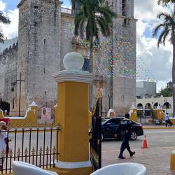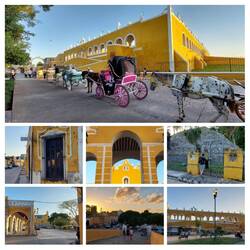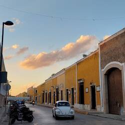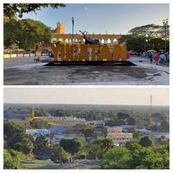Unser letzter Halt soll in Izamal sein, die gelb-weiße Stadt, auch „Pueblo Magico“ (magischer Ort) genannt. Sie symbolisiert das zerstörerische Zusammentreffen der Maya-Kultur mit den eindringenden Spaniern, die die Payramiden in der Umgebung als „Steinbruch“ für ihre Kirchen und Klöster verwendet haben. Das Besteigen der Reste der Kinich-Kakmo-Pyramide können wir mit ein wenig Trittsicherheit gut meistern. Der Aufstieg lohnt, denn man kann ins ganze Umland blicken – Grün wohin das Auge reicht und eine fantastische Sicht auf die Klosteranlage in der Ferne, die wir kurz darauf natürlich auch noch besichtigen werden - und alles gratis. Langsam geht die Sonne unter, die Vögel fliegen beeindruckende Formationen, wir holen uns die besten Churros, die ich je hatte, und nicken auf dem Weg zurück im Auto ein wenig ein. Was für ein Tag!