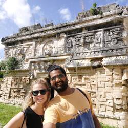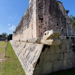 Es lohnt sich, als erster bei den Ruinen von Chichen Itza zu sein, als wir etwas verspätet loskommen und die Schlange passiert haben (8:50 Uhr), sind schon unzählige Gruppen da und die Sonne brennt bereits auf uns hernieder. Etwa 2 Stunden verbringen wir hier und verzichten auf einen Guide. Ich hätte gerne mehr gewusst, aber hatte schon die richtige Vermutung, dass Rish kaum mehr über historische Infos wissen will. Zum Glück, denn sein Interesse ist nach den gelungenen Fotos vor sowohl seinem als auch meinem dritten Weltwunder nach einer halben Stunde so gut wie erschöpft und er schleppt sich nur noch mit. Ich will den Rest auch sehen und er schließt sich natürlich doch an, betitelt dann meine sehr dürftigen Kenntnisse über die verschiedenen Überreste mit (eigentlich unangemessener) Bewunderung: „Oh, you know a lot about this place!“. Ganz so war es nicht, aber ich konnte Pyramide, Zenote, Ballspielort und grobe Regeln, Opferrituale und das Obervatorium ausmachen. Zudem habe ich die Stelle gefunden, wo die Maya die abgeschlagenen Köpfe ihrer Feine/Opfer aufgespießt haben. Die Akustik dieser Gebäude kann durch Klatschen erprobt werden, zudem erwähnenswert ist, dass die Gewinner der Ballspiele, die den Ball nur mit der Hüfte berühren durften, geopfert wurden. Wie meine Spielleistung ausgesehen hätte, kann sich vermutlich jeder vorstellen... Außerdem hat die Pyramide 365 Stufen und beinhaltet weitere Informationen zu dem Sonnenkalender der Maya, zudem gibt es 52 Tafeln. Ultraschall-Aufnahmen zeigen zudem eine Pyramide in der Pyramide in der Pyramide – wie bei einer russischen Matruschka. Zu gerne würde ich mich hineinstehlen.