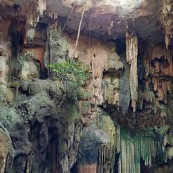 Nach einem herrlichen Buffet mit handgemachten Tortillas geht es zu einer Maya-Anlage Tsukan. Hier kann man Nachbauten von Wohnhäusern betrachten, Essenszubereitungen sehen und testen und einem Reinigungsritual vor dem Baden in der Zenote beiwohnen. Ich werde also wieder einmal geräuchert – doppelt hält besser. Nach dem Räuchern umarmt man einen heiligen Baum, danach geht es in die Zenote, die einer Tropfsteinhöhle ähnelt und beeindruckende Stalaktiten aufweist. Ein gelungener Kontrast, dennoch relativ teuer.