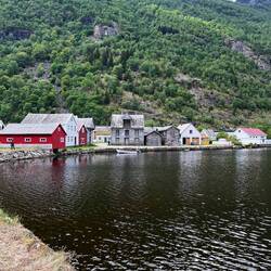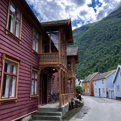 Nach dem Frühstück starten wir Richtung Gudvangen (gesamt ca 3h Fahrt), machen aber erst mal einen Halt in Laerdalsøyri, dem historischen Treffpunkt für Fischer und Bauern, mit Häusern aus dem 18Läs mer