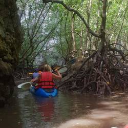 Als wir wohlbehalten abgestiegen waren, beschlossen wir mit dem Roller zum Railay Strand zu fahren, dort zu essen und es uns gut gehen zu lassen. Leider gestaltete sich die Anfahrt etwas kompliziert.Read more