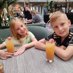 ...mit einem Mocktail an der Hotelbar. Müde und glückliche Kinder