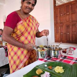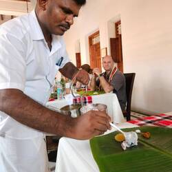Visalam Hotel. Toujours accueilli par un bindi et un cadeau. Et repas servi sur une feuille de bananier.