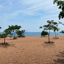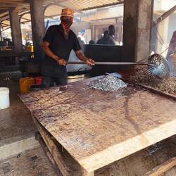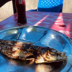 Ein Mann spricht mich an. „Welcome! What’s your name?“, und weil ich so nett bin, sage ich auch noch meinen echten Namen. Ab jetzt bin ich auf dem Markt „Mr. Denis“. Es spricht sich schnell rum, wenn Touris dort alleine unterwegs sind. Und sie sind leichte Beute. Jimmy, wie er sich nennt, sagt, ich soll ihm über den Markt folgen. Was ich auch tue. Schließlich kenne ich mich nicht aus und schätze seine Freundlichkeit. Er macht auch einen sympathischen Eindruck. Er erzählt mir alles über die Fischerei und den Fisch, der hier ankommt. Die Namen vergesse ich sofort wieder, aber es ist extrem spannend. Nicht nur wo die Fische ankommen, zeigt er mir, sondern auch „the kitchen“. Dort wird der Fisch auf Wunsch direkt zubereitet. Ich will das alles sehen und bespreche mit Jimmy, einen Fisch zu kaufen, ihn säubern zu lassen. Anschließend soll der auf dem Grill für mich zubereitet werden, und wir essen ihn zusammen. Die Wahl fällt auf Kabau! Dass mich das am Ende 50.000 Schilling (ca. 15 Euro) kostet, ist für die Jungs, die alle involviert waren, ein Mega-Deal. Ihrem jetzt besten Freund, „Mr. Denis“ aus Deutschland, tut das nicht weh, aber es war so deutlich über den üblichen Handelspreisen vor Ort, dass ich mir vornehme, nicht allen blind zu vertrauen. Auch wenn ich es währenddessen schon gemerkt habe. Gezahlt habe ich es gerne, da mir der eine Euro mehr wirklich nicht weh tut. Und weil ich viel zu lieb bin, nein zu sagen …