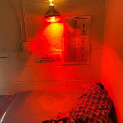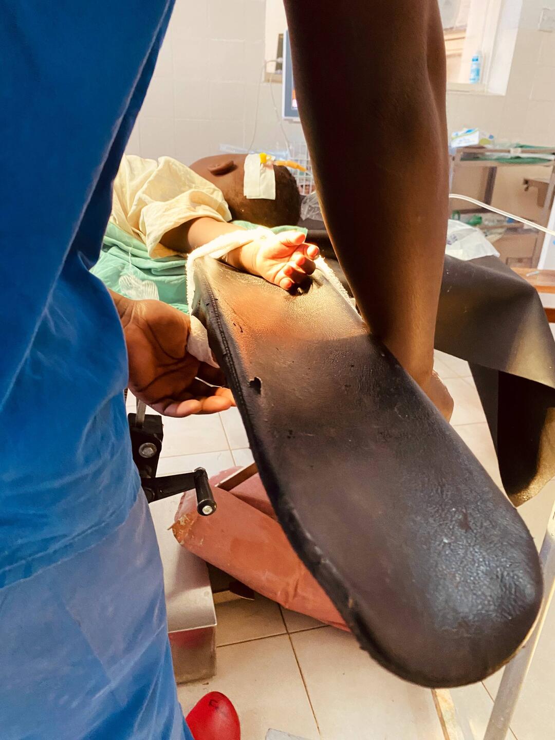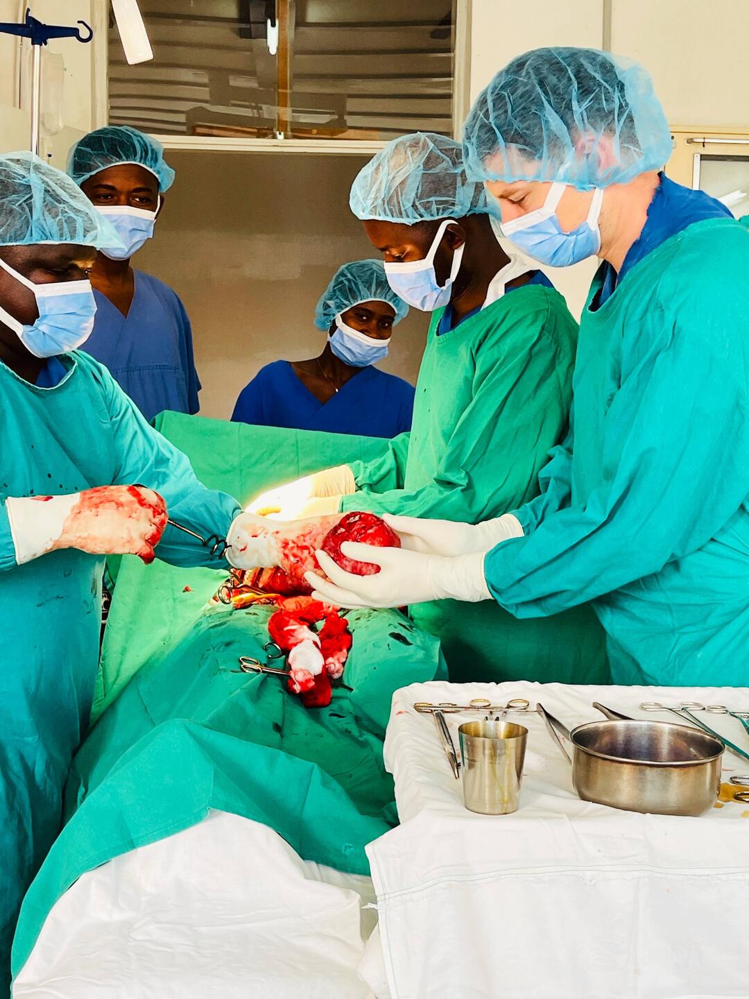Das Kind wird von der Hebamme entgegengenommen und direkt untersucht sowie unter eine Wärmelampe gelegt. Es ist eine Wärmelampe aus der Hühnerzucht, aber sie tut hier genauso gut Dienst wie in der Landwirtschaft. Ein gesundes Mädchen schreit und ist wohlauf. Jetzt beginnt der handwerkliche Teil. Die Plazenta muss raus. Da die eine Klemme noch an der Nabelschnur hängt, die mit der Plazenta verbunden ist, wickelt Dr. Aikidu sie langsam um das Instrument und zieht behutsam daran. Mit kreisenden Bewegungen löst er sie vorsichtig ab. Da liegt nun der Mutterkuchen. Er ist vollständig und kommt weg. Letzter Schritt. Ein kleines Stück vom Damm ist gerissen (der Teil zwischen Anus und Vaginaleingang). Ich reiche Nadel und Faden an. Mit zwei Stichen ist das Problem behoben. Die Frau liegt erleichtert, aber erschöpft da. Wir gratulieren ihr und geben ihr die nötige Ruhe sowie die Medikamente, die sie benötigt (vor allem Oxytocin, damit sich die Gefäße, die in die Plazenta führten, schließen).