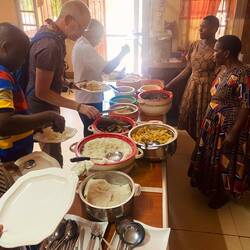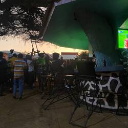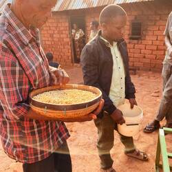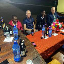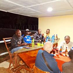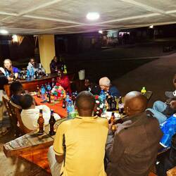 Am Abend erwartet uns Father Raphael. Er hat eine Abschiedsparty für Christian und Ludwig organisiert, die 25 Jahre ehrenamtliches Engagement für Litembo und die Menschen hier geleistet haben. Im Hostel, das zum Krankenhaus gehört, gibt es Chips (Kartoffelecken), Rindfleisch und Huhn. Eine feurige Soße dazu. Auf dem Tisch stehen Bierflaschen und Wein. Für die Handwerker (Fundis) gleicht das einem Feiertag, und dementsprechend werden die Teller großzügig befüllt. Wenn es etwas für sie gibt, wird es dankend angenommen. Nach dem Essen wird die Stimmung ausgelassen. Der ein oder andere Fundi muss sich bemühen, noch ein vernünftiges Englisch zu sprechen, während die Musik lauter gedreht wird. Neben afrikanischen Hits spielt auch deutsche Musik – Christian übernimmt die Playlist. So ertönen auch Culcha Candela mit „Hamma!“ oder Peter Fox in dem kleinen Lokal.